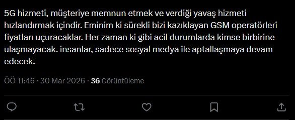 Öte yandan Bakan Uraloğlu’nun paylaşımının altına yapılan yorumlar dikkat çekti. Özellikle afet döneminde ulaşım ağlarının zayıflamasına dikkat çeken bir kullanıca, “5G hizmeti, müşteriye memnun etmek ve verdiği yavaş hizmeti hızlandırmak içindir. Eminim ki sürekli bizi kazıklayan GSM operatörleri fiyatları uçuracaklar. Her zaman ki gibi acil durumlarda kimse birbirine ulaşmayacak. insanlar, sadece sosyal medya ile aptallaşmaya devam edecek” ifadelerini kullandı.