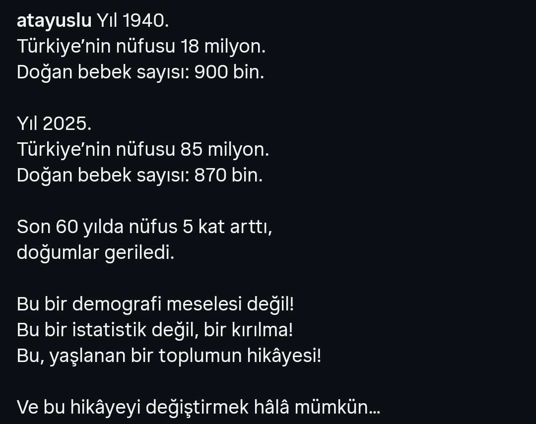 "Yıl 1940. Türkiye'nin nüfusu 18 milyon. Doğan bebek sayısı: 900 bin. Yıl 2025. Türkiye'nin nüfusu 85 milyon. Doğan bebek sayısı: 870 bin. Son 60 yılda nüfus 5 kat arttı, doğumlar geriledi. Bu bir demografi meselesi değil! Bu bir istatistik değil, bir kırılma! Bu, yaşlanan bir toplumun hikâyesi! Ve bu hikâyeyi değiştirmek hâlâ mümkün..."