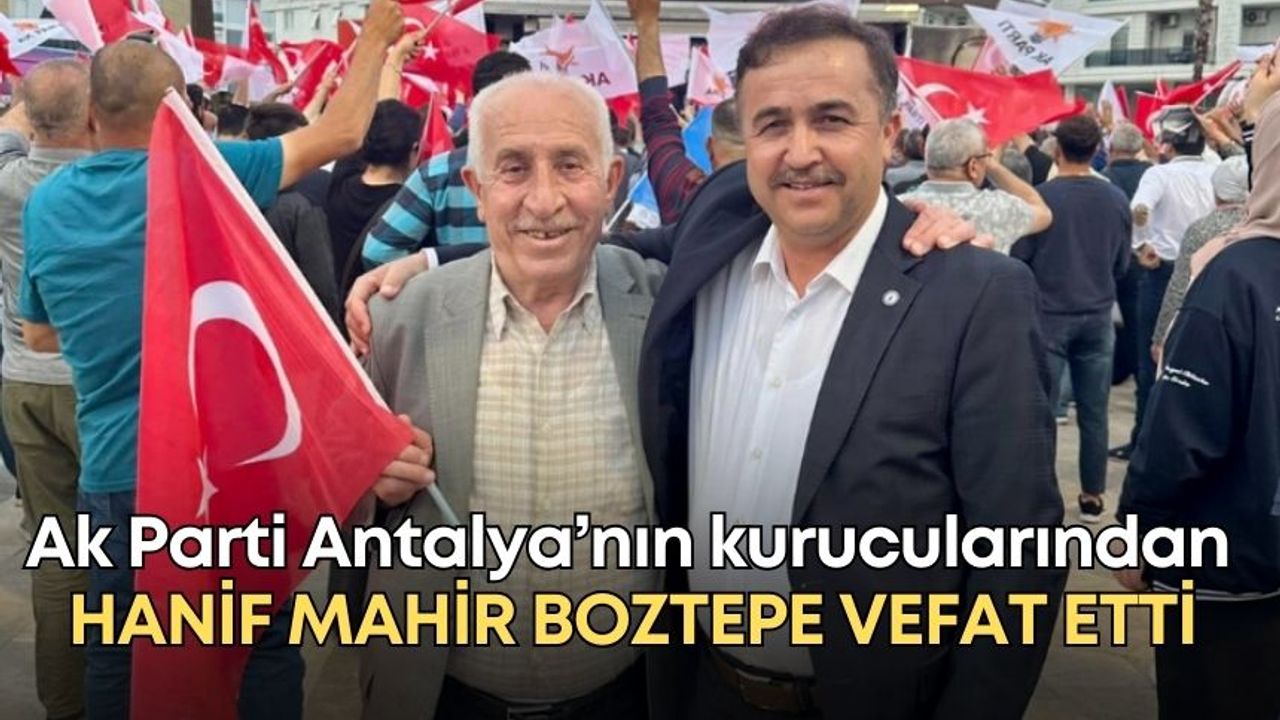 AK Parti Antalya’nın kurucu kadrolarında yer alan ve Antalya siyasetinde uzun yıllar görev yapan Hanif Mahir Boztepe hayatını kaybetti. Antalya’da hem Ak Parti İl Kurucular Kurulu’nda hem de belediye meclislerinde görev alarak önemli sorumluluklar üstlenen Boztepe’nin vefatı, sevenleri ve siyasi camiada büyük üzüntü yarattı.