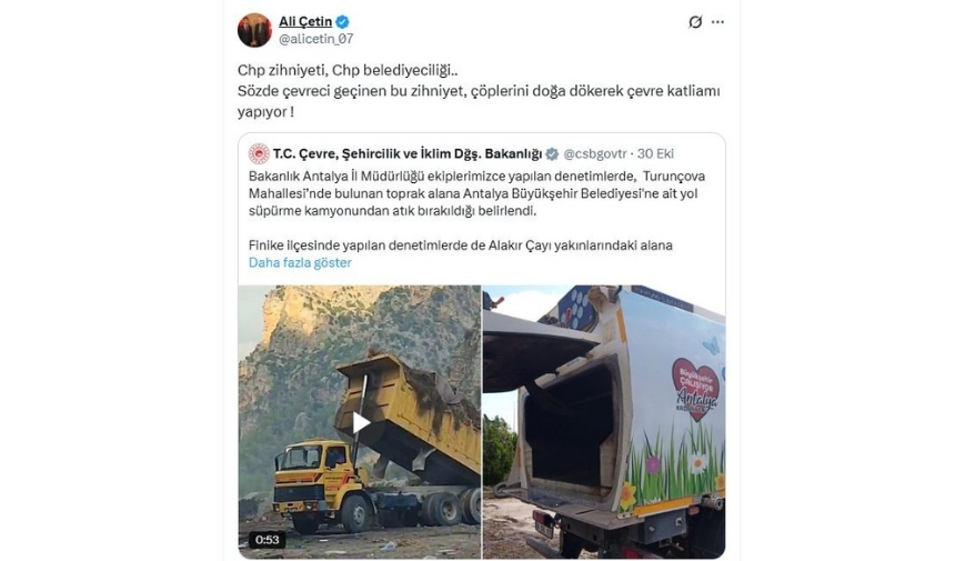 Ak Parti Antalya İl Başkanı Ali Çetin, Büyükşehir ve Finike Belediyesi'nin bahçe ve sera atıkları başta olmak üzere çeşitli plastik ve karışık atıklarını doğaya zarar verecek şekilde attıklarını ifade etti. CHP’li belediyelerin suçüstü yakalandıklarını ifade eden Çetin, "Sözde çevreci geçinen bu zihniyet, çöplerini doğa dökerek çevre katliamı yapıyor. Çevre, Şehircilik ve İklim Değişikliği Bakanlığı ekipleri CHP’li belediyeleri suçüstü yakaladı” şeklinde konuştu.