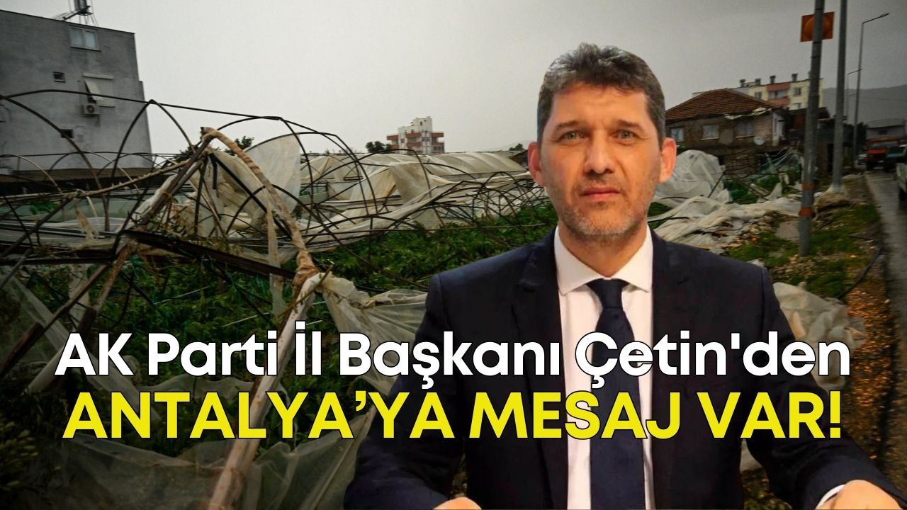 Antalya genelinde dün geceden itibaren etkisini artıran sağanak yağış, fırtına ve hortum, kentin birçok noktasında hayatı olumsuz etkiledi. Yaşanan doğal afetlerin ardından bir açıklama yapan AK Parti Antalya İl Başkanı Ali Çetin, olumsuz hava koşullarından etkilenen vatandaşlara destek mesajı verdi. Çetin, afet anından itibaren sürecin yakından takip edildiğini belirterek tüm hemşehrilerine geçmiş olsun dileklerini iletti.