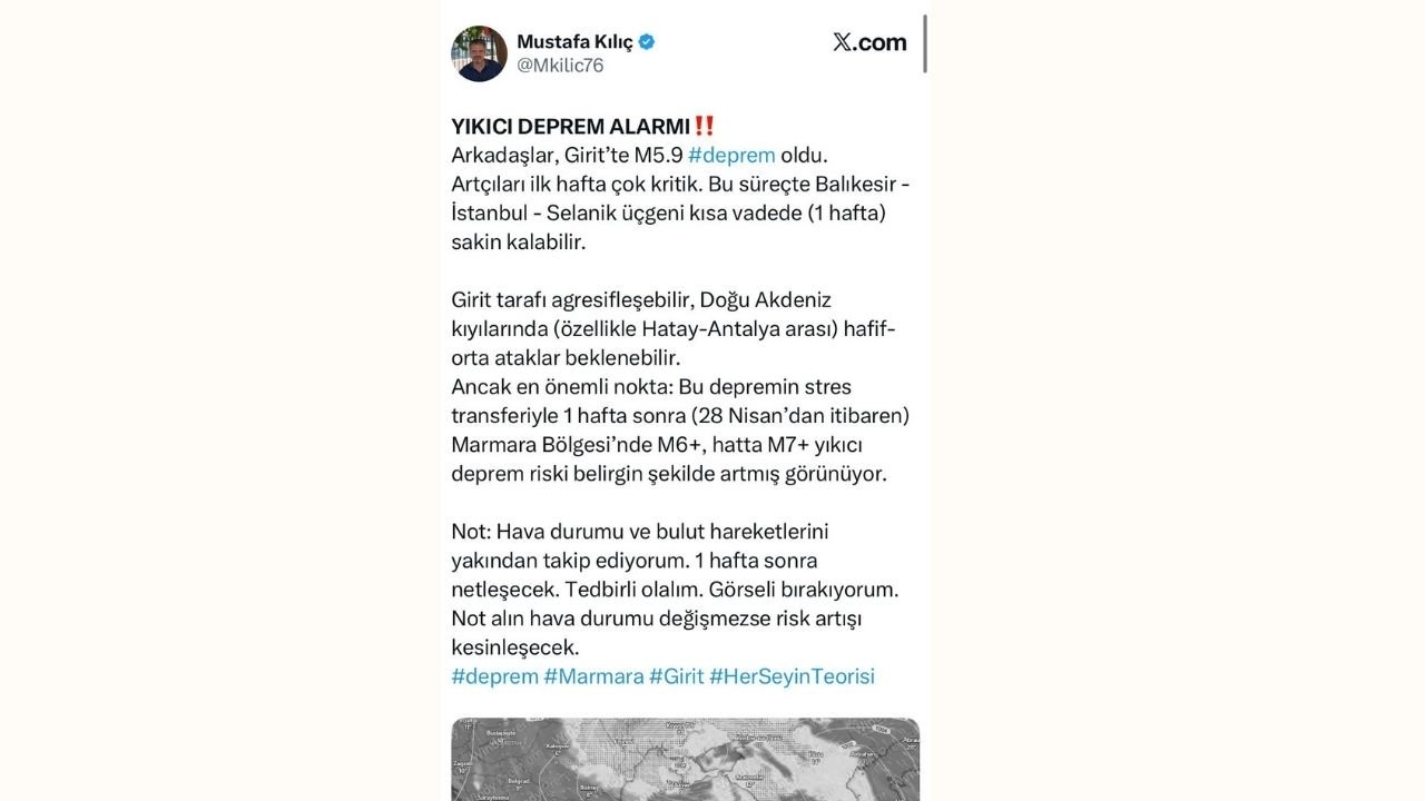 Sosyal medya hesabından depreme ilişkin açıklama yapan Uzman Mustafa Kılıç, “Artçıları ilk hafta çok kritik. Bu süreçte Balıkesir - İstanbul - Selanik üçgeni kısa vadede (1 hafta) sakin kalabilir. Girit tarafı agresifleşebilir, Doğu Akdeniz kıyılarında (özellikle Hatay-Antalya arası) hafif-orta ataklar beklenebilir. Ancak en önemli nokta: Bu depremin stres transferiyle 1 hafta sonra (28 Nisan’dan itibaren) Marmara Bölgesi’nde M6+, hatta M7+ yıkıcı deprem riski belirgin şekilde artmış görünüyor. Not: Hava durumu ve bulut hareketlerini yakından takip ediyorum. 1 hafta sonra netleşecek. Tedbirli olalım. Görseli bırakıyorum. Not alın hava durumu değişmezse risk artışı kesinleşecek” ifadelerini kullandı.