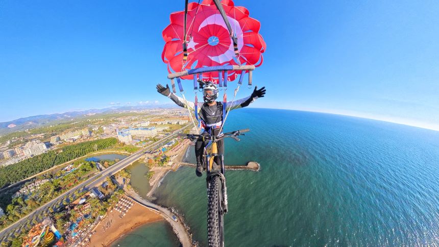 Antalya'nın Alanya ilçesine bağlı Türkler Mahallesi açıklarında gerçekleştirilen etkinlikte, Sky to Sea Dağ Bisikleti Yarışı'nın 'hardtail' kategorisi birincisi ve Antalya'da düzenlenen DownTown yarışlarında Türkiye birincisi olan Mevlüt Çavuşoğlu Spor Lisesi öğrencisi Yiğit Efe Al, özel olarak hazırlanan düzeneğiyle dağ bisikletini deniz paraşütü sistemine bağladı.