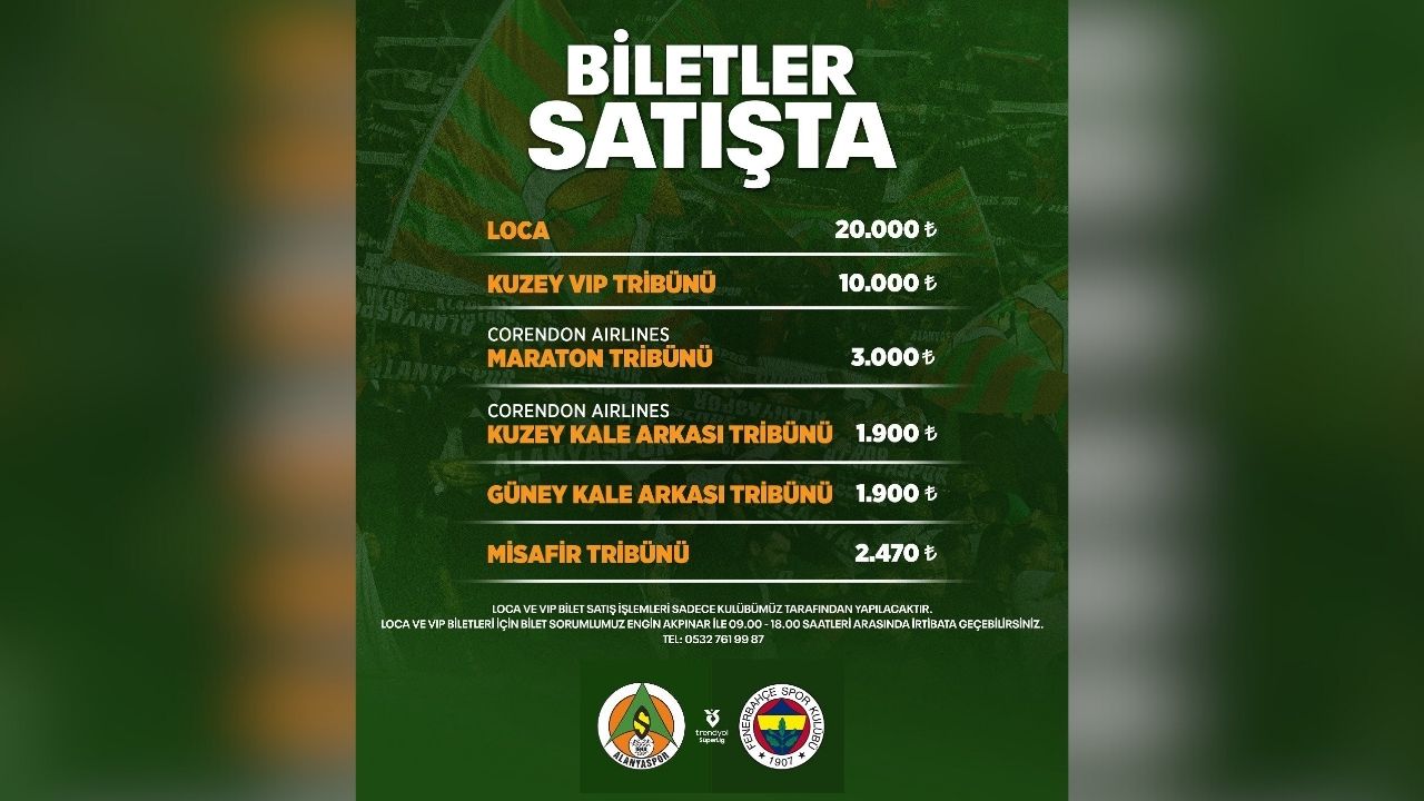 Oba Stadyumu'nda saat 20.00'de başlayacak Alanyaspor-Fenerbahçe karşılaşması için satışa sunulan biletlerin fiyatları tribünlere göre farklılık gösteriyor. Buna göre, Loca biletleri 20 bin TL'den, Kuzey VIP Tribünü biletleri 10 bin TL'den satışa çıktı. Corendon Airlines Maraton Tribünü 3 bin TL olarak belirlenirken, Corendon Airlines Kuzey Kale Arkası Tribünü ile Güney Kale Arkası Tribünü biletleri bin 900 TL'den taraftarlarla buluştu. Misafir tribünü bilet fiyatı ise 2 bin 470 TL olarak açıklandı.
