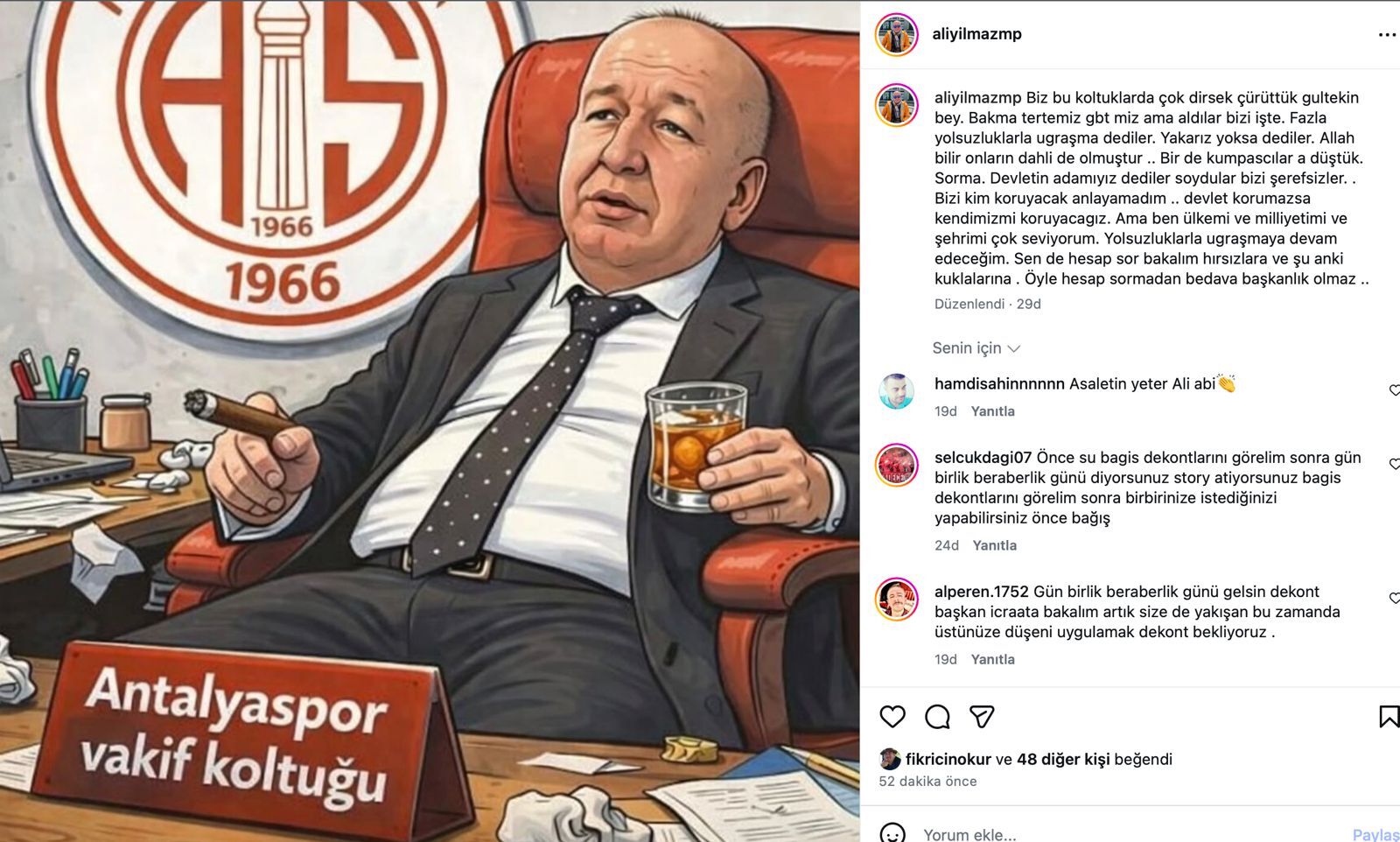Yılmaz sosyal medya hesabından Gencer’in resmedilmiş bir de fotoğrafını paylaştı. Gencer’in elinde puro diğer elinde ise içecek olduğu resmedildi. Yılmaz, geçmişte kulüp yönetiminde görev yaptıklarını belirterek, “Biz bu koltuklarda çok dirsek çürüttük Gültekin Bey. Bakma tertemiz GBT’miz ama aldılar bizi işte. ‘Fazla yolsuzluklarla uğraşma’ dediler. ‘Yakarız yoksa’ dediler” ifadelerini kullandı. Sürecin arkasında farklı isimlerin olabileceğini öne süren Yılmaz, “Allah bilir onların dahli de olmuştur. Bir de kumpasçılara düştük. ‘Devletin adamıyız’ dediler, soydular bizi. Bizi kim koruyacak anlayamadım.” dedi.