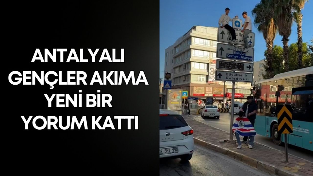 Antalya’da yön tabelasına gelen gençler, akıma kendilerince yeni bir yorum getirdi. Tabelanın önüne gelen bazı gençler, burada vatandaşların gözü önünde saç kesimi yaptı. Bazıları da tabelanın üzerine çıkarak poz verdi. Çevredeki vatandaşlar ise yaşan bu durumu şaşkınlıkla izledi. O anlar ise bir cep telefonu kamerası tarafından saniye saniye kaydedildi.