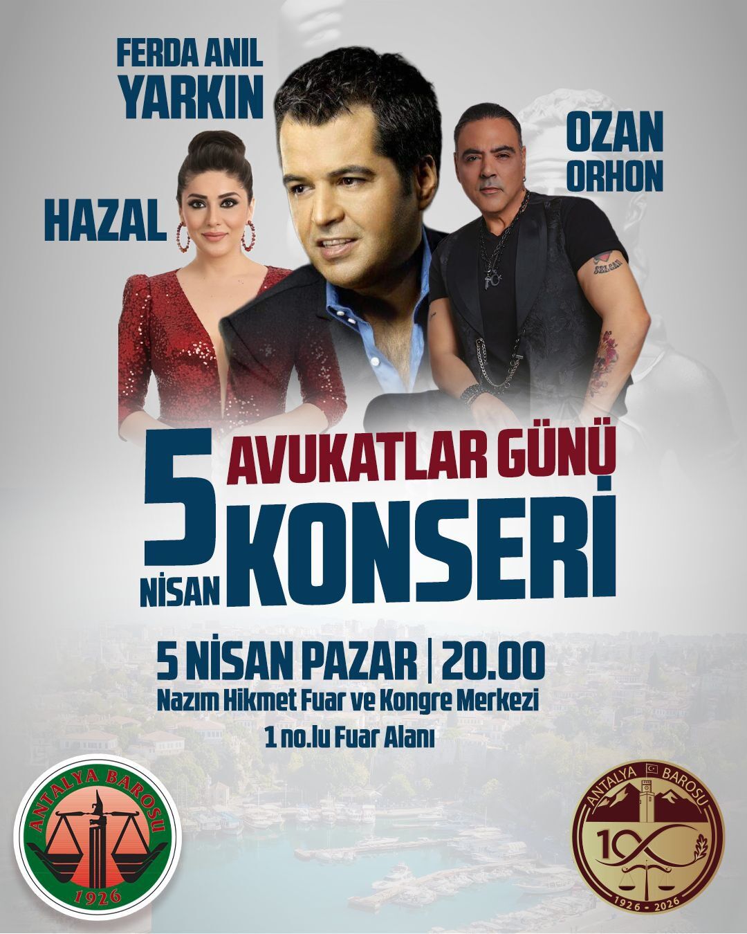 Antalya Barosu 1926-2026 vizyonuyla organize edilen bu özel gecede, Türk müziğinin sevilen isimleri sahne alacak. Konser afişinde paylaşılan bilgilere göre Sanatçı Ferda Anıl Yarkın, Hazal ve Ozan Orhon, muhteşem performanslarıyla avukatlarla buluşacak.