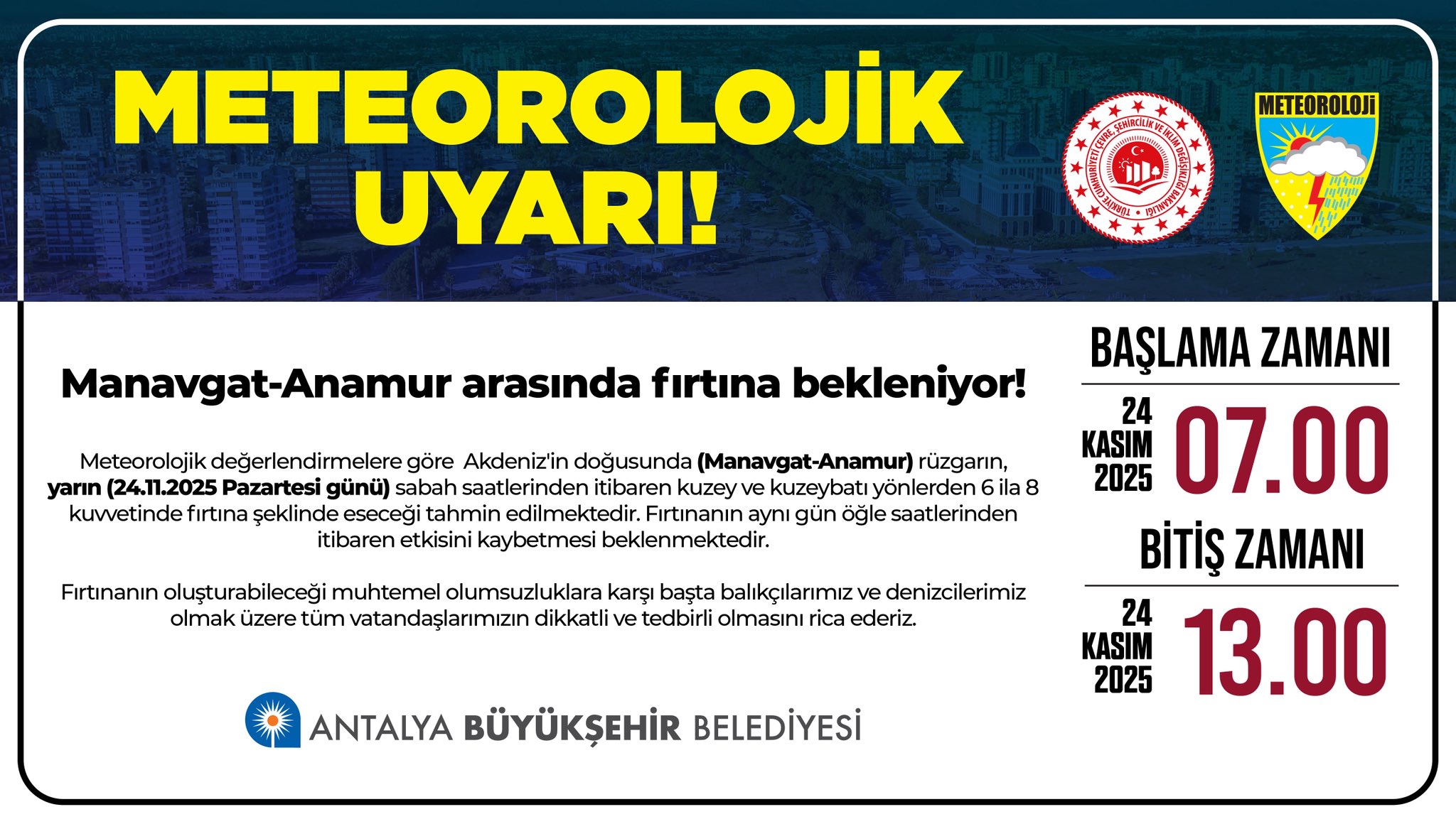 Antalya Büyükşehir Belediyesi Akdeniz’in doğusunda etkili olması beklenen fırtına için uyarı paylaşımı yaptı. Açıklamaya göre, Manavgat–Anamur hattında rüzgârın yarın (24 Kasım 2025, Pazartesi) sabah saatlerinden itibaren kuzey ve kuzeybatı yönlerinden 6 ila 8 kuvvetinde fırtına şeklinde eseceği öngörülüyor.