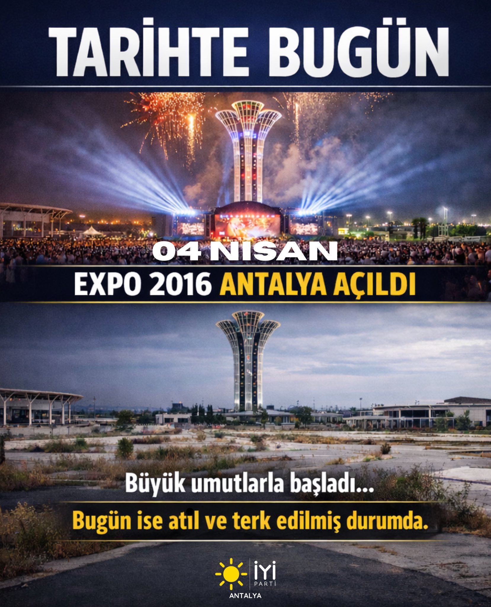 İYİ Parti Antalya İl Başkanlığı’nın resmi sosyal medya hesabından yapılan paylaşımda, Antalya için büyük bir vizyon olarak sunulan sergi alanının geldiği nokta eleştirildi. İYİ Parti Antalya İl Başkanlığı, "Tarihte Bugün" notuyla paylaştığı mesajda, beklenen etkinin oluşturulamadığını ve milyarlarca liralık yatırımın sürdürülebilir hale getirilemediğini ifade etti. İYİ Parti Antalya İl Başkanlığı, kamu kaynaklarının doğru planlanmasının gelecek nesillere karşı en büyük sorumluluk olduğunu vurguladı.