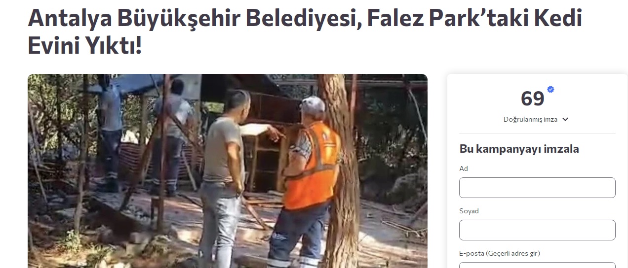 Antalya’nın önemli yeşil alanlarından biri olan Falez Park’taki kedi evinin Antalya Büyükşehir Belediyesi tarafından kaldırılması, hayvanseverlerin tepkisine yol açtı. Olayın ardından, "Kullanıcıların sosyal, çevresel veya politik konularda imza kampanyaları başlatıp destek toplayabildiği çevrimiçi bir platform" olan Change.org üzerinden başlatılan imza kampanyası kısa sürede dikkat çekti.