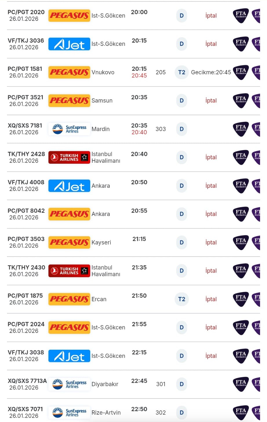 İptal edilen uçuş listesinde Türkiye’nin dört bir yanına yapılacak seferler yer aldı. Özellikle İstanbul Sabiha Gökçen ve İstanbul Havalimanı varışlı uçuşların büyük çoğunluğu iptal edilirken; Ankara, Samsun, Kayseri, Mardin ve Diyarbakır seferleri de hava muhalefetine takıldı. Uluslararası hatlarda ise KKTC Ercan ve Moskova Vnukovo seferlerinde ciddi aksamalar ve iptaller yaşandı.