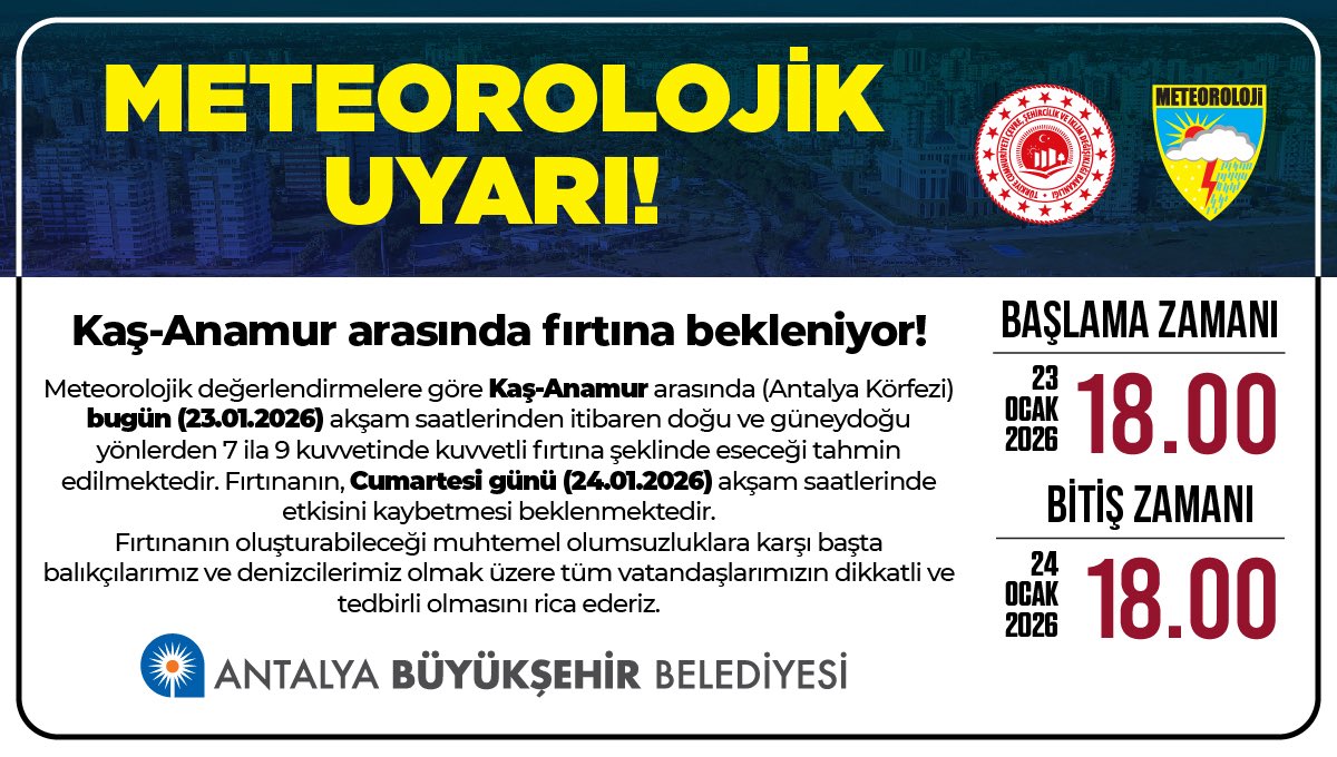 Meteoroloji verilerini takip eden Antalya Büyükşehir Belediyesi, Akdeniz’in doğu ve güneydoğu kesimlerini kapsayan ciddi bir hava olayına karşı acil durum uyarısı yayınladı. Özellikle Kaş ve Anamur arasındaki geniş sahil bandını (Antalya Körfezi) etkisi altına alacak olan kuvvetli fırtınanın, bölgedeki deniz yaşamını ve kıyı güvenliğini tehdit etmesi bekleniyor.