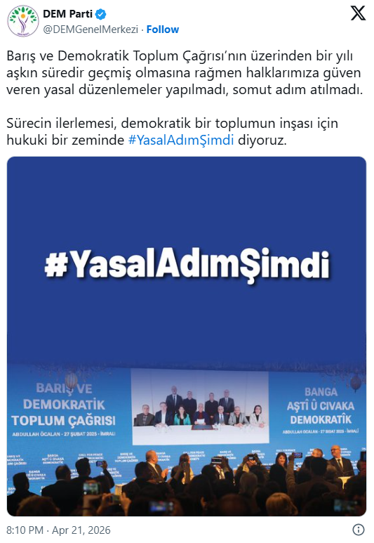 Halkların Eşitlik ve Demokrasi Partisi (DEM Parti) Antalya Milletvekili Saruhan Oluç, Medya Haber bünyesindeki Gün Ortası programında yaptığı açıklamada, çözüm sürecinin ilerlemesi için şeffaf bir yol haritası ve ortak takvim gerektiğini vurguladı. DEM Parti resmi hesabından yapılan açıklamada ise Barış ve Demokratik Toplum Çağrısı üzerinden 1 yılı aşkın süre geçmesine rağmen somut adım atılmadığı belirtilerek #YasalAdımŞimdi etiketiyle çağrı yapıldı.