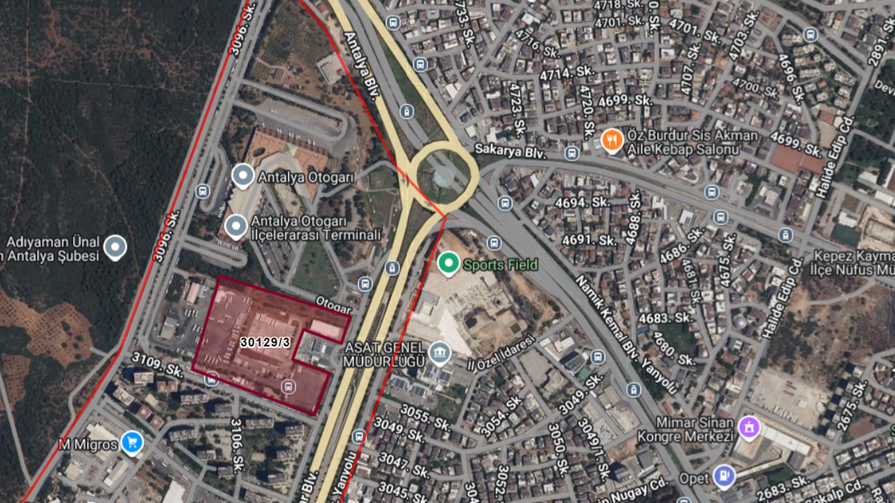 Antalya Vakıflar Bölge Müdürlüğü tarafından satışa çıkarılan taşınmaz, Kepez ilçesi Yenidoğan Mahallesi’nde, 30129 ada 3 parsel numarasıyla kayıtlı bulunuyor. Arsa, Antalya Şehirlerarası Otobüs Terminali’nin yanı başında, ana ulaşım akslarının kesişim noktasında yer almasıyla dikkat çekiyor.