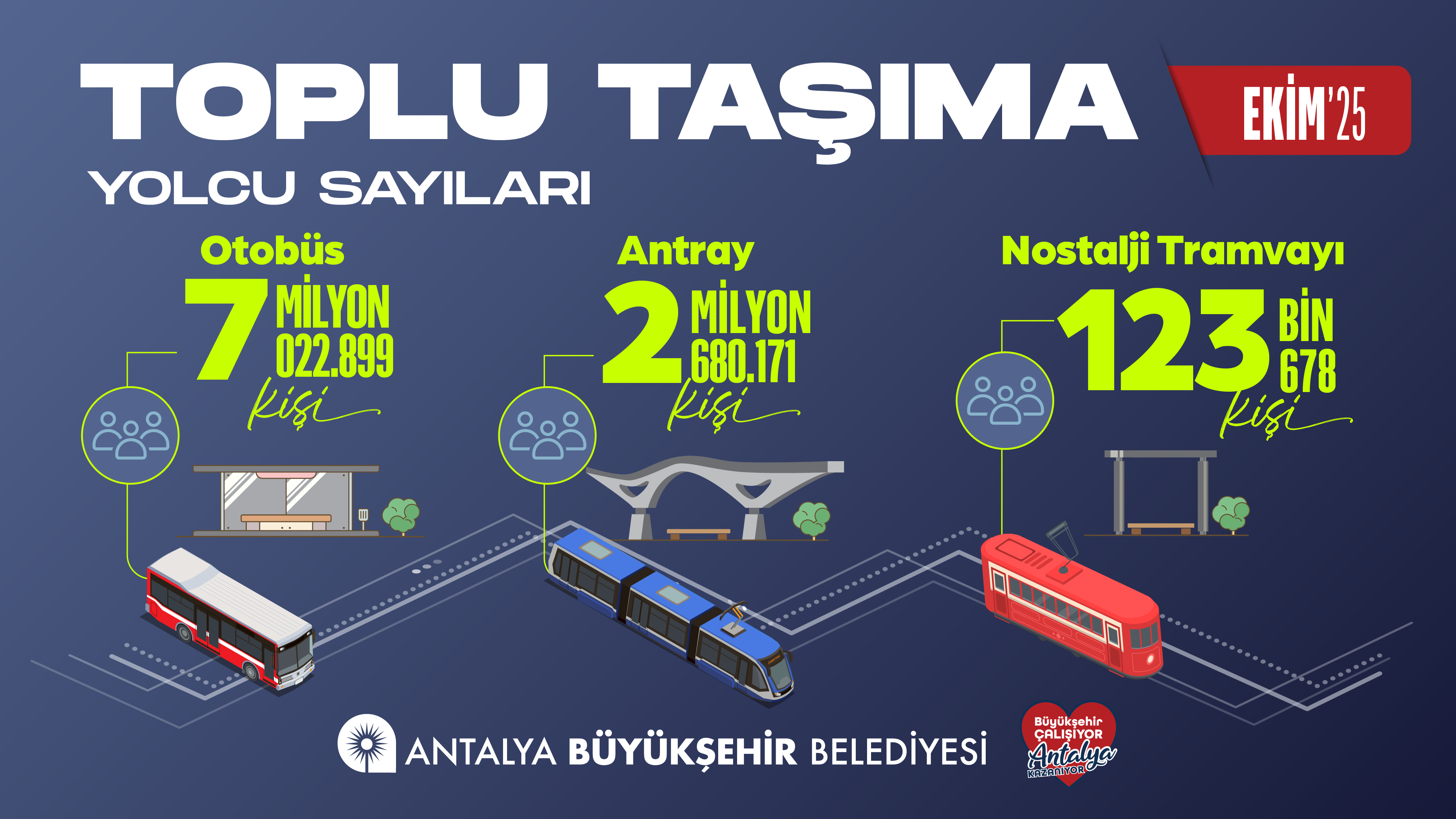 Antalya Büyükşehir Belediyesi, yaptığı açıklamada, "Ekim ayında 9.8 milyon yolcumuzla birlikte şehrin her köşesine ulaştık. Daha konforlu, güvenli ve sürdürülebilir ulaşım için durmadan çalışıyoruz" ifadelerine yer verdi.