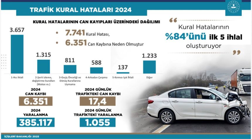 Trafik kazalarının büyük bölümünün belirli ihlallerden kaynaklandığını ifade eden Yerlikaya, Türkiye’de meydana gelen her 100 trafik kazasının 84’ünün yalnızca 5 temel kural ihlalinden oluştuğunu belirtti. Bu ihlallerin; hız sınırının aşılması, şerit izleme ve şerit değiştirme kurallarına uyulmaması, geçiş önceliği ve dönüş kurallarının ihlali, arkadan çarpma ve kırmızı ışık ihlali olduğunu söyledi.