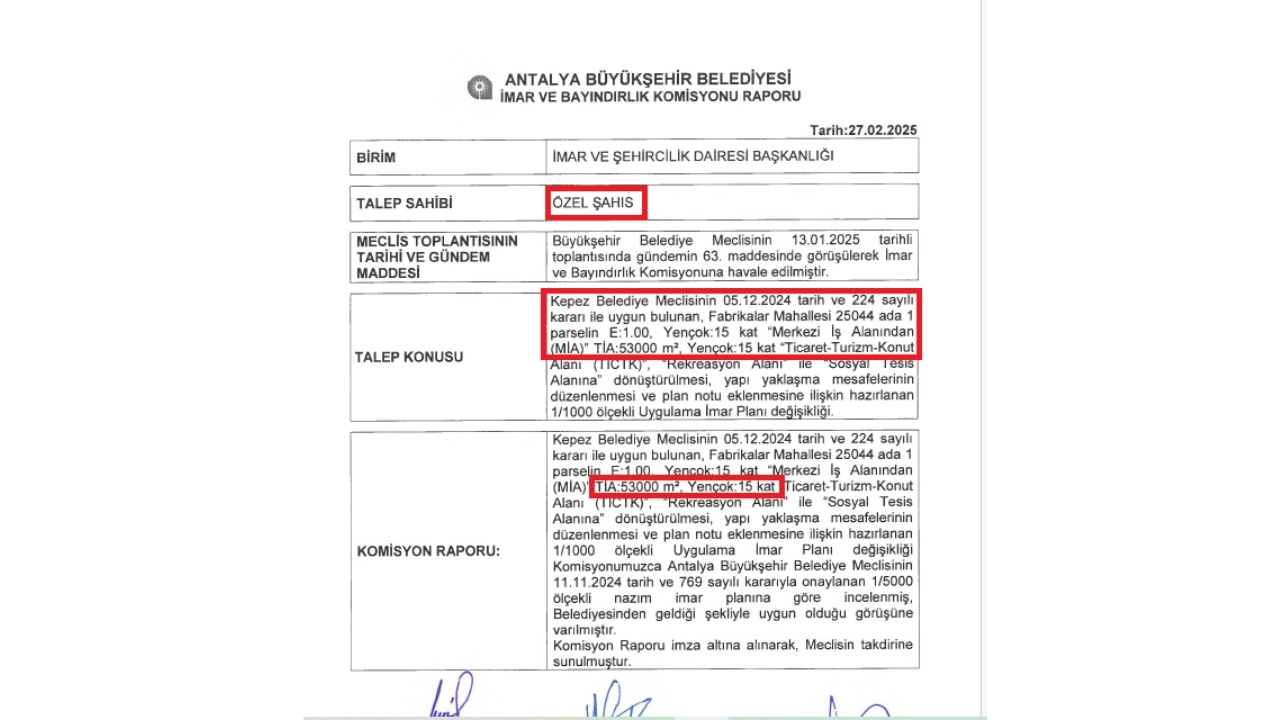 Antalya’da iki yıldır tartışmaların odağında olan KİPA AVM arazisinde yapılması planlanan rezidans projesi için Büyükşehir Belediyesi’nin onayladığı imar planı değişikliğinde 53 bin m2 olarak belirtilen toplam inşaat alanı ÇED dosyasında 133 bin 806 m2’ye çıktı. Daha önce 32 bin m2 inşaat alanına sahip olan parselde yapılan plan değişikliği ile toplamda 100 bin m2’den fazla imar rantı sağlandığı öne sürüldü. Daha önce 2 katlı AVM’nin bulunduğu parselde plan değişikliği ile 15 katlı inşaat yapma olanağı getirilirken, hazırlanan projenin ÇED raporunda kat sayısının da 18’e çıkarıldığı görülüyor. Plan değişikliğinin iptali için açılan davada 23 Ocak günü bilirkişi keşfi yapılacağı belirtildi.
