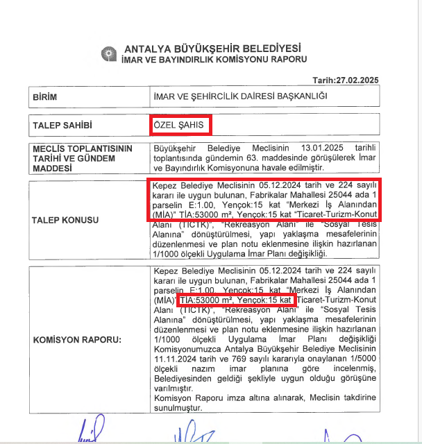 Antalya’nın Kepez ilçesi Fabrikalar Mahallesi’nde bulunan Migros’a ait KİPA AVM arazisi, Temmuz 2024’de Ankara merkezli Fidanlar İnşaat adlı özel bir şirket tarafından satın alındı. İki katlı AVM’nin bulunduğu parselin imar planı ise geçtiğimiz yıl değiştirildi. Antalya Büyükşehir Belediye Meclisi’ne sunulan söz konusu parselle ilgili plan değişikliği talebinde bölgede otel ve lüks konuta ihtiyaç olduğu savunulurken, daha önceki planda 32 bin 274 m2 olan inşaat alanının 53 bin m2’ye çıkarılması talebi Meclis tarafından onaylandı.