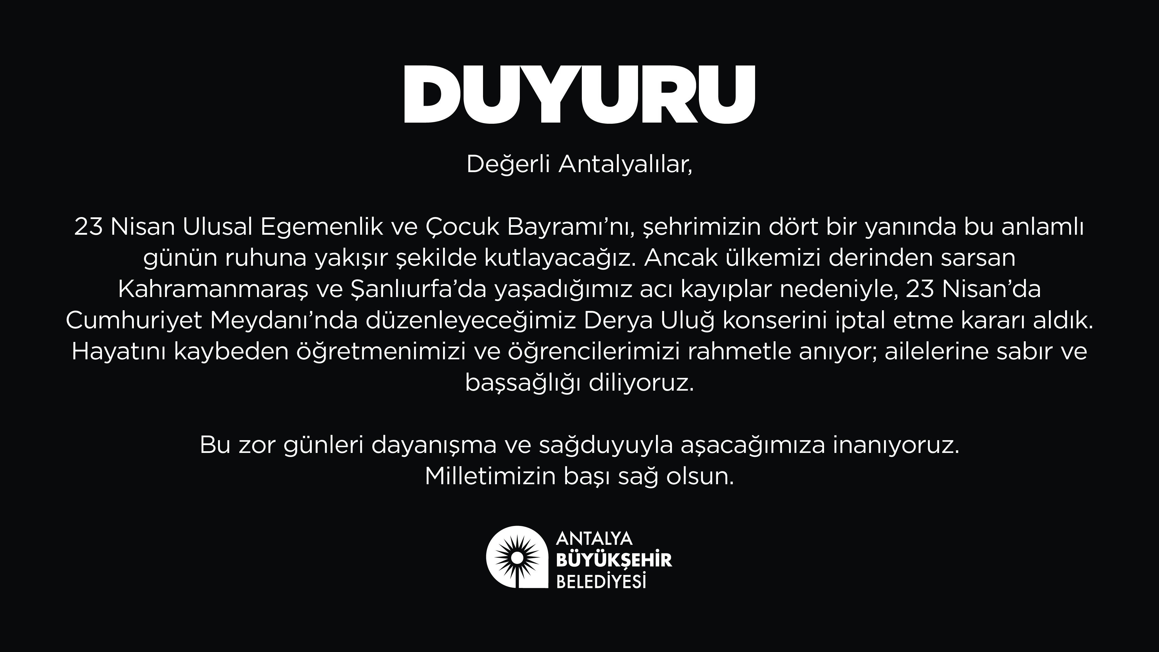 Özdemir, açıklamasında şu ifadelere yer verdi: “Değerli Antalyalılar, 23 Nisan Ulusal Egemenlik ve Çocuk Bayramı’nı, şehrimizin dört bir yanında bu anlamlı günün ruhuna yakışır şekilde kutlayacağız. Ancak ülkemizi derinden sarsan Kahramanmaraş ve Şanlıurfa’da yaşadığımız acı kayıplar nedeniyle, 23 Nisan’da Cumhuriyet Meydanı’nda düzenleyeceğimiz Derya Uluğ konserini iptal etme kararı aldık. Hayatını kaybeden öğretmenimizi ve öğrencilerimizi rahmetle anıyor; ailelerine sabır ve başsağlığı diliyoruz. Bu zor günleri dayanışma ve sağduyuyla aşacağımıza inanıyoruz. Milletimizin başı sağ olsun.”
