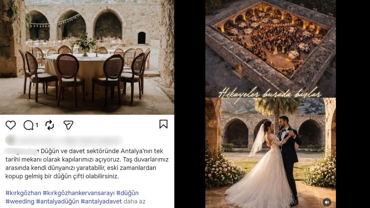 Firma, yaz sezonunda yapılacak 400 kişilik bir düğün organizasyonu için 200 bin TL + KDV ücret talep ediyor. Düğünler için 5 farklı konseptte yemek menüsü sunulduğu belirtilirken, tarihi han yalnızca düğünler için değil; çeşitli eğlence partileri ve klip çekimleri için de kiralanıyor. Organizasyon şirketinin sosyal medya duyurusunda, “Düğün ve davet sektöründe Antalya’nın tek tarihi mekanı olarak kapılarımızı açıyoruz. Taş duvarlarımız arasında kendi dünyanızı yaratabilir, eski zamanlardan kopup gelmiş bir düğün çifti olabilirsiniz” ifadelerine yer verildi.