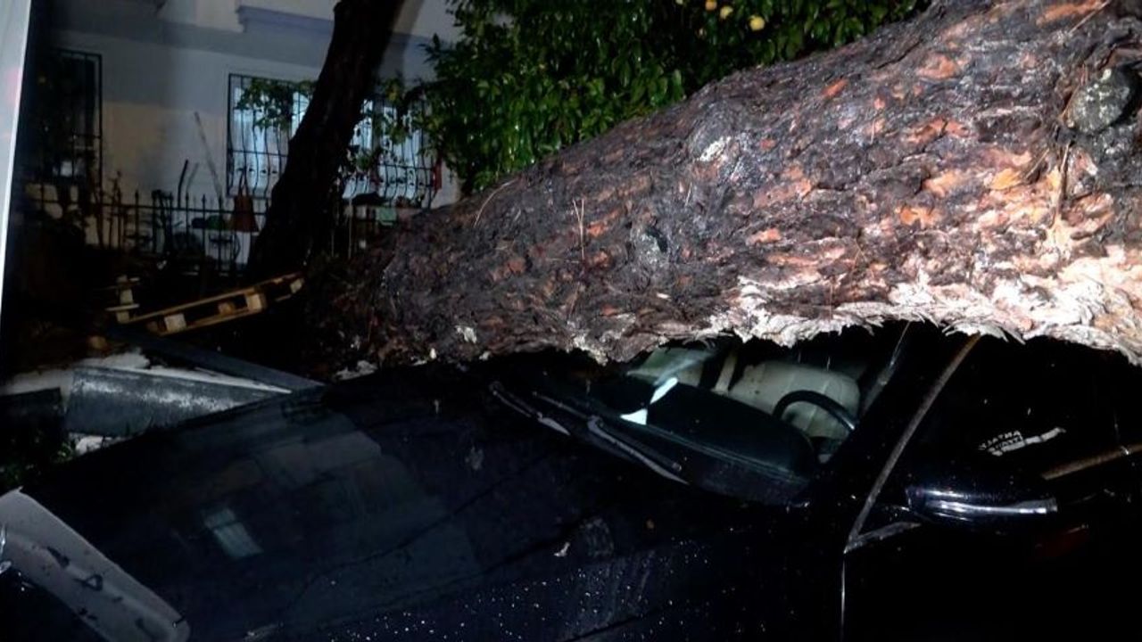 Sarı alarm verilen Antalya'da etkili olan yağış ve şiddetli rüzgar daha önce şikayet edildiği iddia edilen ağacın devrilmesine yol açtı. Olayda iki araç ve bir binada hasar oluşurken şans eseri kimse yaralanmadı.