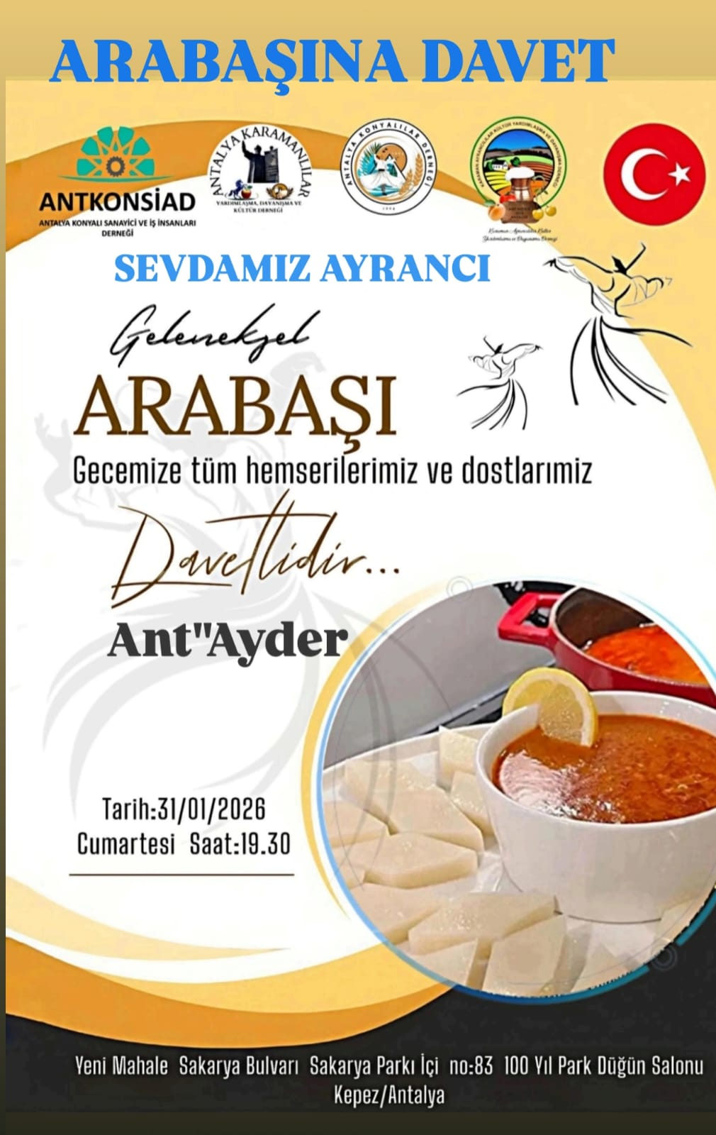 Antalya’da yaşayan İç Anadolulu hemşehriler, birlik ve beraberliği pekiştirmek amacıyla dev bir organizasyona imza atıyor. Antalya KONSİAD, Antalya Karamanlılar Derneği, Antalya Konyalılar Derneği ve Karaman Ayrancılılar Derneği’nin ortaklaşa düzenlediği Geleneksel Arabaşı Gecesi, bu yıl 6’ncı kez kapılarını açıyor. Siyaset, iş dünyası ve sivil toplum kuruluşlarını aynı sofrada buluşturacak olan etkinlik, İç Anadolu’nun kış aylarındaki vazgeçilmez geleneği olan arabaşını, Antalya’nın sosyal hayatıyla bütünleştirmeyi hedefliyor.