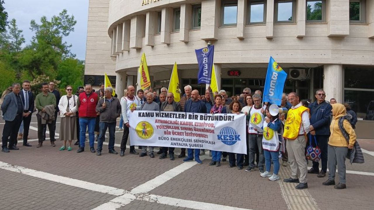 Antalya’da kamu çalışanları yeniden alanlarda. KESK üyeleri, iktidarın kamu çalışanlarına yönelik uyguladığı ücret politikaları karşısında, çalışanların açlık ve yoksullukla mücadele ettiğine dikkat çektiler. KESK adına açıklama yapan Büro Emekçileri Sendikası Şube Başkanı Devrim Mol, “Son yasal düzenleme ile öncelikle iktidarın mevcut 4688 Sayılı Yasayı ve bu yasaya göre imza altına alınan toplu sözleşme hukukunu ortadan kaldırmak olduğu bilinmelidir” dedi.