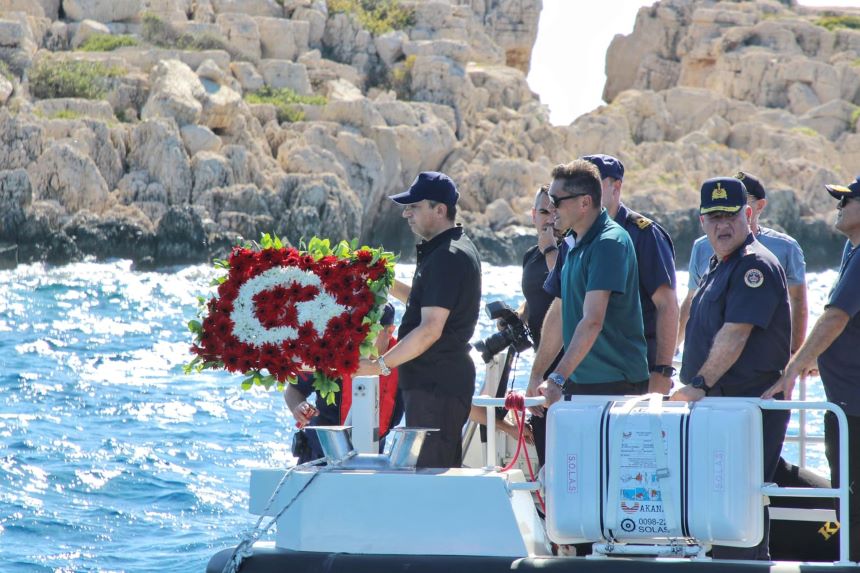 Konuşmaların ardından Vali Hulusi Şahin ve beraberindeki heyet, Kaş Limanı’ndan Sahil Güvenlik teknesiyle denize açılarak 36 şehitin bulunduğu noktaya ulaştı. Vali Şahin burada, şehitlerin aziz hatırasına denize çelenk bıraktı. Daha sonra 36 şehitin anısına 36 dalgıç Türk bayraklarıyla su yüzüne çıkarak hep birlikte İstiklal Marşı’nı okudu.