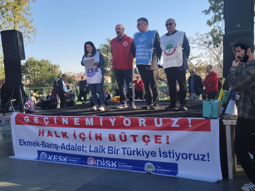 Antalya’da bugün düzenlenen miting nedeniyle polis Aydın Kanza Parkı ile Cumhuriyet Meydanı arasında olağanüstü güvenlik önlemleri aldı. Katılımın oldukça yüksek olduğu mitingde, kitle örgütleri yaşanan sorunları sloganlara yansıttı. Yürüyüşün ardından Cumhuriyet Meydanı’nda toplanan kitle örgütleri basın açıklaması gerçekleştirdi. Kitle adına açıklamayı KESK Antalya Dönem Sözcüsü Devrim Mol gerçekleştirdi. Mol, “Hepimizin bildiği gibi 2026 yılı Bütçesi TBMM inde görüşülüyor. Biliyoruz ki, bu ülkenin bütçesi biz milyonların maaşlarından ve çarşıda, pazarda, ekmeğimizden, suyumuzdan alınan vergilerden oluşuyor. Ama sıra adil bölüşüme gelince, biz yokuz. Ne zaman “insanca yaşamak istiyoruz” desek, “Bütçe imkânı yok”, “kaynaklar yetersiz” diyorlar. Kaynak var ama kaynak, sermayeye teşvike, faize, savaşa, yandaş müteahhide gidiyor. Kaynak var ama bunlarda utanma yok” diye konuştu.