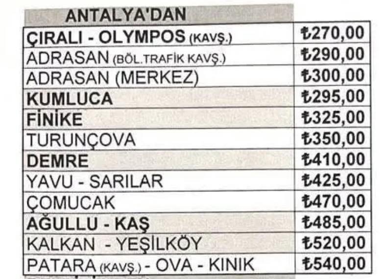 Toplu ulaşımdaki yeni tarifeye göre; Antalya-Kumluca arası 295, Antalya -Finike 325, Antalya-Demre 410, Antalya-Kalkan 520, Antalya-Kınık arası ise 540 TL oldu.