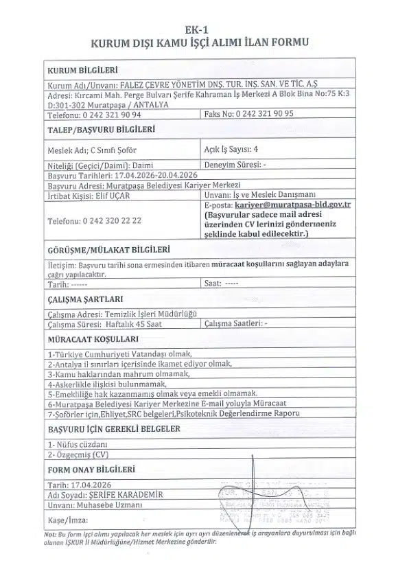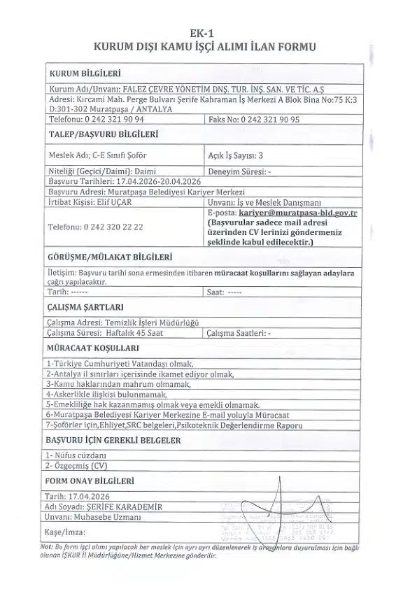Antalya Muratpaşa Belediyesi, Temizlik İşleri Müdürlüğü kadrosunu güçlendirmek amacıyla toplam 7 personelin istihdam edileceğini açıkladı. 17 Nisan 2026 tarihinde başlayan başvuru süreci 20 Nisan 2026 tarihine kadar devam edecek. Adayların başvurularını e-posta yoluyla iletmeleri beklenirken, özellikle şoför kadrosu için mesleki yeterlilik belgeleri ön plana çıkıyor.