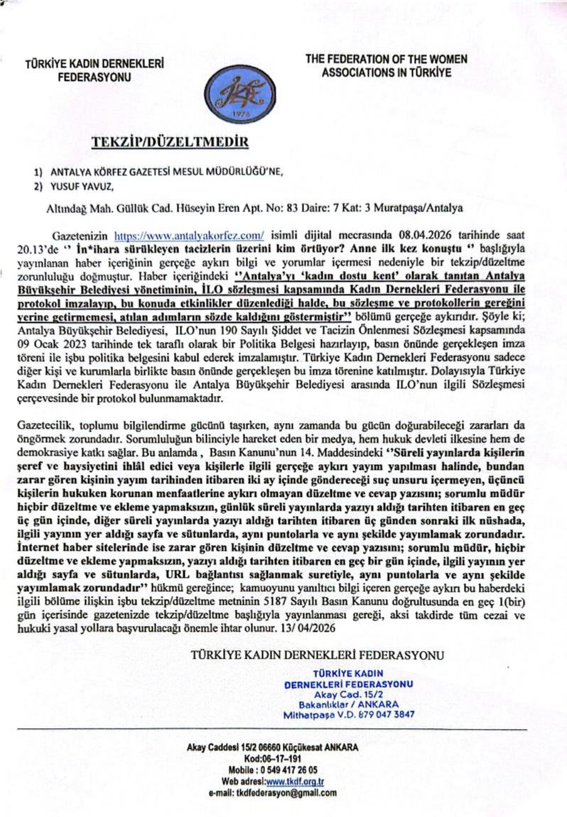 Bu süreçte tacize uğrayan kızının intiharın eşiğinden döndüğünü anlatan anne A.G., iki yıldır yaşadıklarını dile getirerek belediyenin bu süreçteki tutumunu eleştirdi. Anne A.G.’nin dile getirdiği ve haberimizde yer verdiğimiz “Antalya’yı kadın dostu kent olarak tanıtan Antalya Büyükşehir belediyesi yönetiminin ILO Sözleşmesi kapsamında kadın dernekleri federasyonuyla protokolü imzalayıp bu konuda etkinlikler düzenlediği halde bu sözleşme ve protokollerin gereğini yerine getirmemesi atılan adımların sözde kaldığını göstermiştir” şeklindeki ifadelerin gerçeğe aykırı olduğu öne süren TKDF, belediye ile kurumsal işbirliğini inkar eden bir tekzip ve düzeltme metni gönderdi.