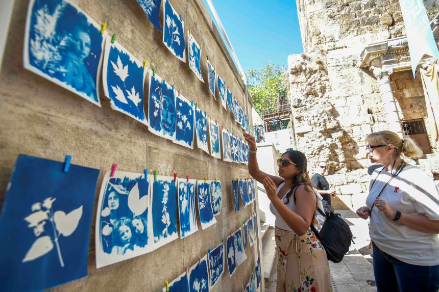 Festivalde yoğun ilgi gören etkinliklerden biri de Üç Kapılar’da gerçekleştirilen güneş baskı çalışması oldu. Fotoğrafların karanlık odada bekletilme sürecini anımsatan bu atölyede, katılımcılar önce güneş ışığıyla renk değiştiren özel bir kimyasalı kâğıtlarının üzerine sürdü. Ardından, kâğıtların üzerine resimlerinde yer almasını istedikleri çiçekleri ve portreleri yerleştirerek, çalışmalarını yaklaşık 10 dakika boyunca Hadrian Kapısı’nın altında güneşlendirdi. Bu sürecin ardından kâğıtlar, koyu mavi tonunu alana kadar suda bekletildi. Eserler daha sonra Üç Kapılar girişine asılarak kurumaya bırakıldı.
