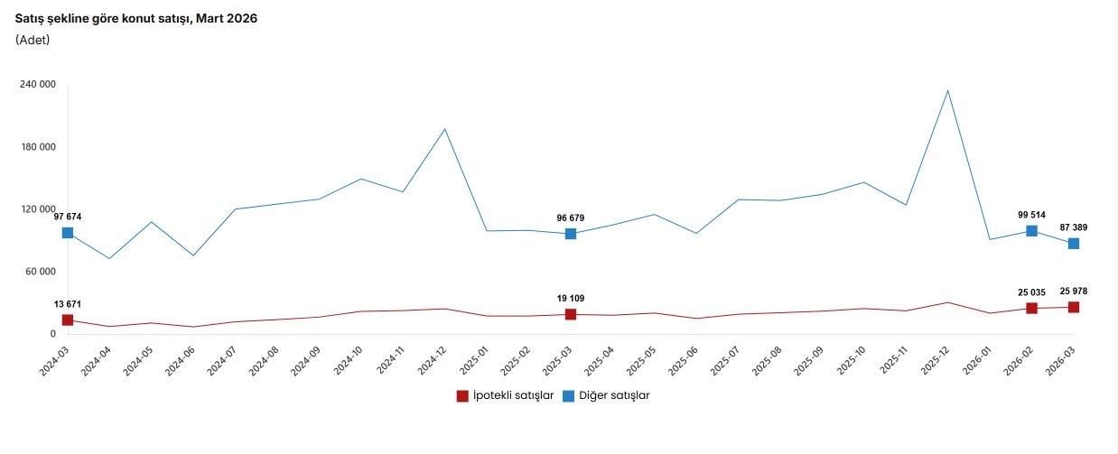 Konut piyasasında en dikkat çekici gelişme ipotekli satışlarda yaşandı. İpotekli konut satışları Mart ayında yüzde 35,9 artarak 25 bin 978’e yükseldi. Buna karşın diğer satış türleri yüzde 9,6 azaldı.
