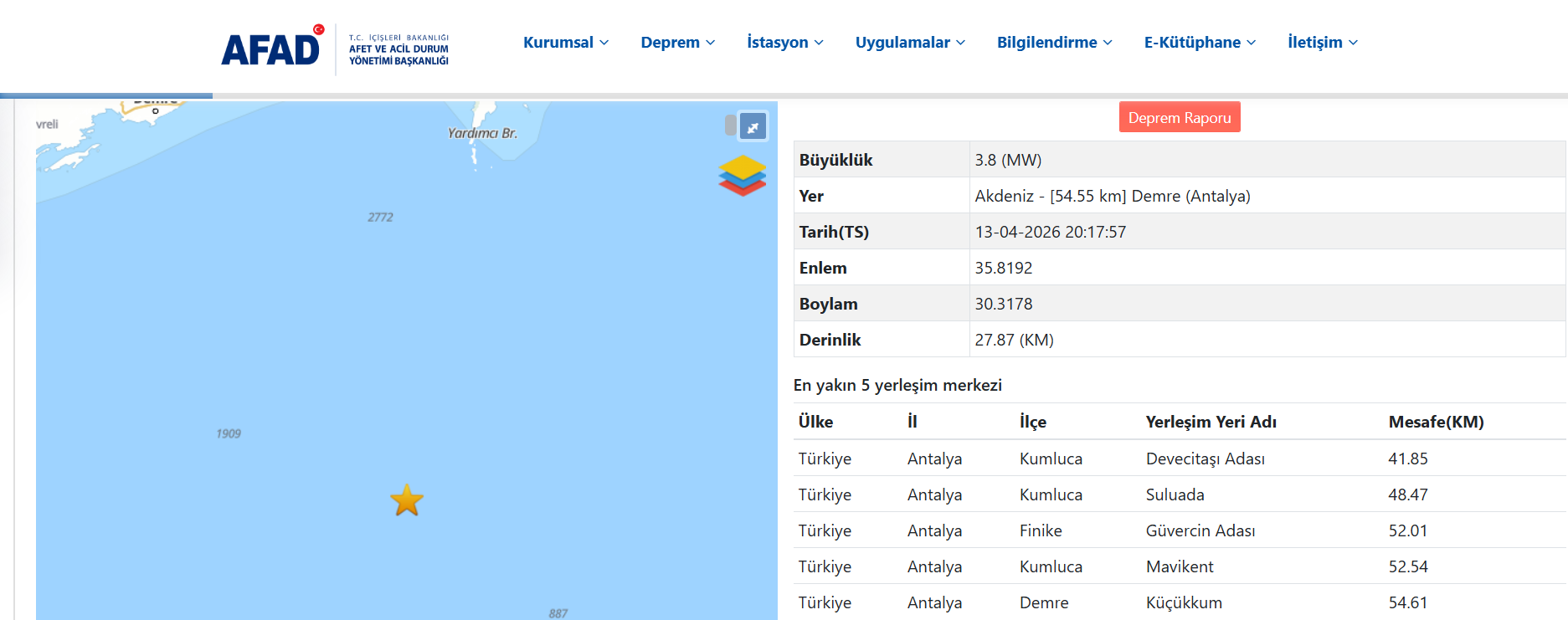 Akdeniz'de akşam saatlerinde hareketli dakikalar yaşandı. Başbakanlık Afet ve Acil Durum Yönetimi Başkanlığı (AFAD) tarafından paylaşılan verilere göre, saat 20:17:57'de merkez üssü Antalya'nın Demre ilçesi açıkları olan bir yer sarsıntısı kaydedildi.