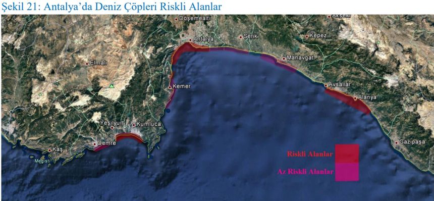 Antalya'da, yüzey akıntıları, hakim rüzgar yönleri, şehirleşme, turizm ve denizcilik aktiviteleri, tarımsal aktiviteler, vatandaşlar tarafından yapılan bildirimler ve bilimsel çalışmalar dikkate alındığında kent merkezi, Alanya, Finike ve Kumluca ilçesinin sahillerinin bulunduğu Finike Körfezi ile Kemer ilçesindeki Beldibi ve Göynük sahillerinin deniz çöpleri bulunma açısından riskli, Manavgat, Belek, Aksu, Kemer merkez ve Demre sahillerinin deniz çöpleri açısından az riskli olduğu değerlendirildi.