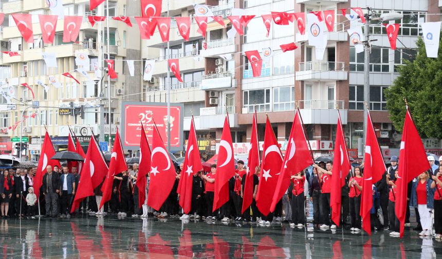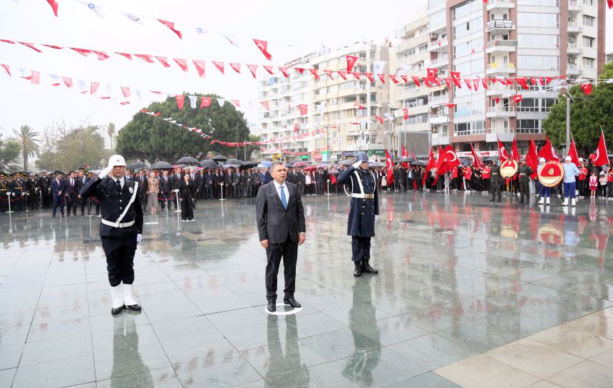 Antalya'da Cumhuriyet Bayramı kutlamaları sağanak altında Cumhuriyet Meydanı'ndaki Atatürk Anıtı'na çelenk sunumu ile başladı. Valilik, Garnizon Komutanlığı ve Büyükşehir Belediyesi çelenklerinin ardından siyasi partiler ve sivil toplum örgütleri de anıta çelenk sunumu gerçekleştirdi.