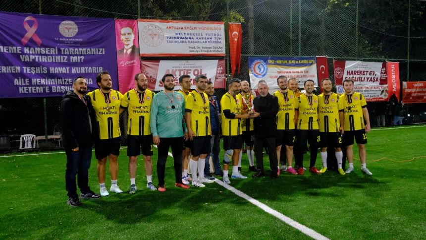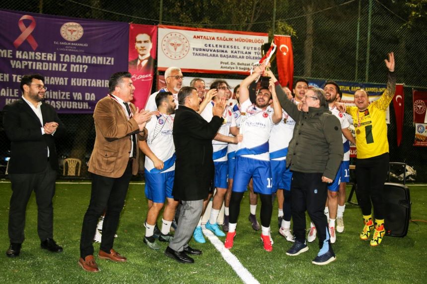 Antalya Sağlıkspor takımı şampiyonluk kupasını ve madalyalarını Antalya İl Sağlık Müdürü Prof. Dr. Behzat Özkan’ın elinden aldı. İl Sağlık Müdürü Prof. Dr. Behzat Özkan, turnuvaya katılan tüm takımlara teşekkür ederek, sağlıklı yaşam için sporun önemine dikkat çekti. Turnuva 2.si SGK Antalya İl Müdürlüğü takımı kupa ve Madalyalarını Antalya SGK İl Müdürü Mehmet Tanrıöver’in elinden aldı. Turnuva 3.sü Eczacılar Odası takımı kupasını ve madalyalarını Antalya İl Sağlık Müdürlüğü Destek Hizmetleri Başkanı Sadettin Güzel’in elinden aldı.