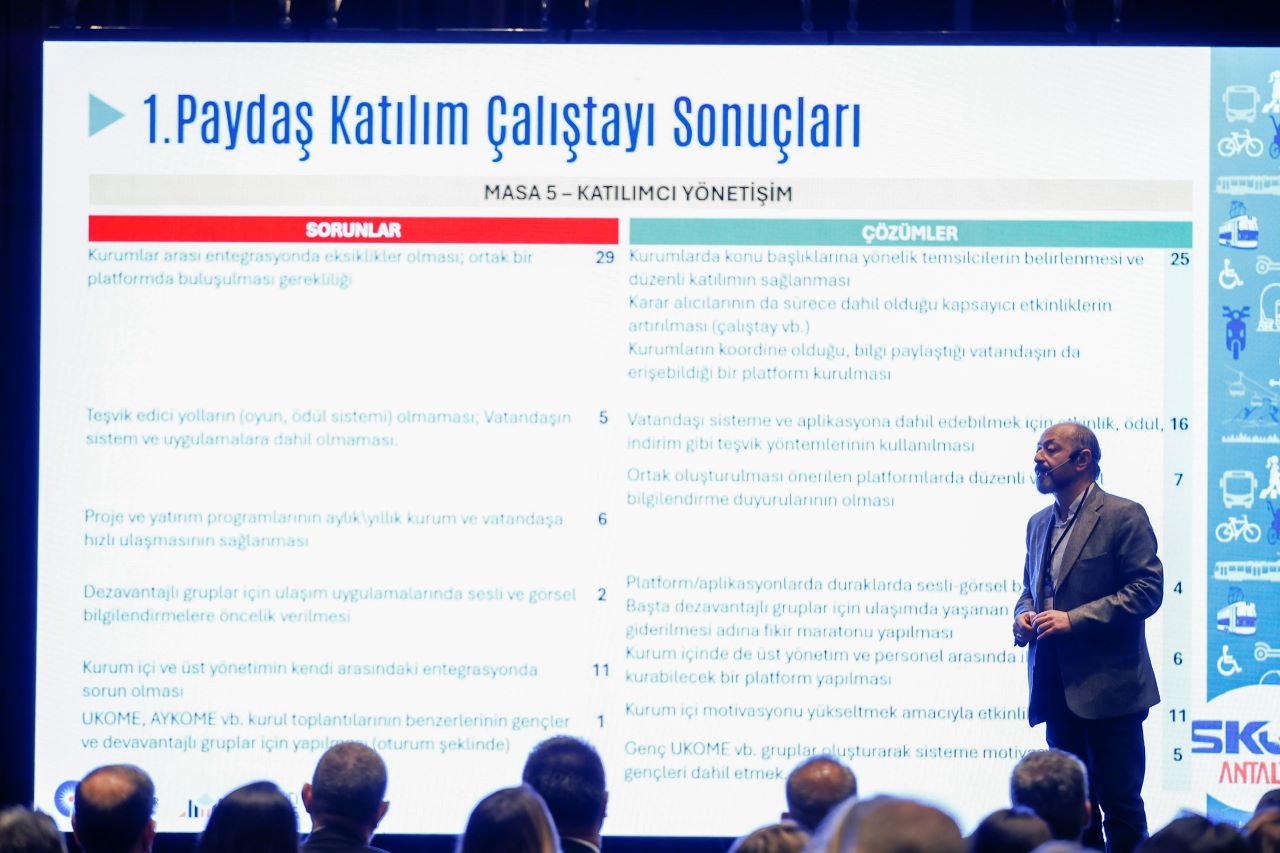 Antalya Sürdürülebilir Kentsel Ulaşım Ana Planı Proje Müdürü Melike Sarım Boynuyoğun ise yürütülen çalışmalara ilişkin şu bilgileri verdi: “Gerçekleştirilen ilk çalıştayda önemli fikirler ortaya çıktı. Özellikle motorlu ve motorsuz ulaşım, bisiklet yolları, yaya ulaşımı ve engelli erişimi konularında önemli öneriler aldık. Ulaşım çok boyutlu bir konu. Biz tüm paydaşlarımızla bu konuları değerlendiriyoruz. Kent merkezi başta olmak üzere yaya yollarının ve yaya bölgelerinin oluşturulmasını tartışıyoruz. Toplu taşımada önemli başlıklarımızdan biri raylı sistemdir. Katılımcılarımızla birlikte tüm bu konuları değerlendiriyoruz.”