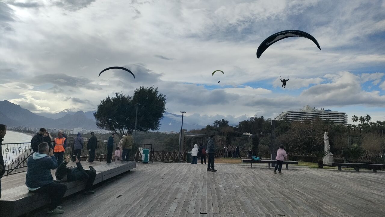 Antalya’nın en önemli turizm noktalarından biri olan varyant seyir terası, günün her saatinde sunduğu manzarayla hem yerli hem de yabancı turistlerin uğrak noktaları arasında yer alıyor. Ancak bu noktayı cazip kılan bir diğer unsur ise yamaç paraşütçülerinin gerçekleştirdiği uçuşlar. Özellikle öğleden sonra denizden esen rüzgârın etkisiyle bölgeye gelen sporcular, hazırlıklarını tamamladıktan sonra paraşütlerini açarak kendilerini gökyüzüne bırakıyor.
