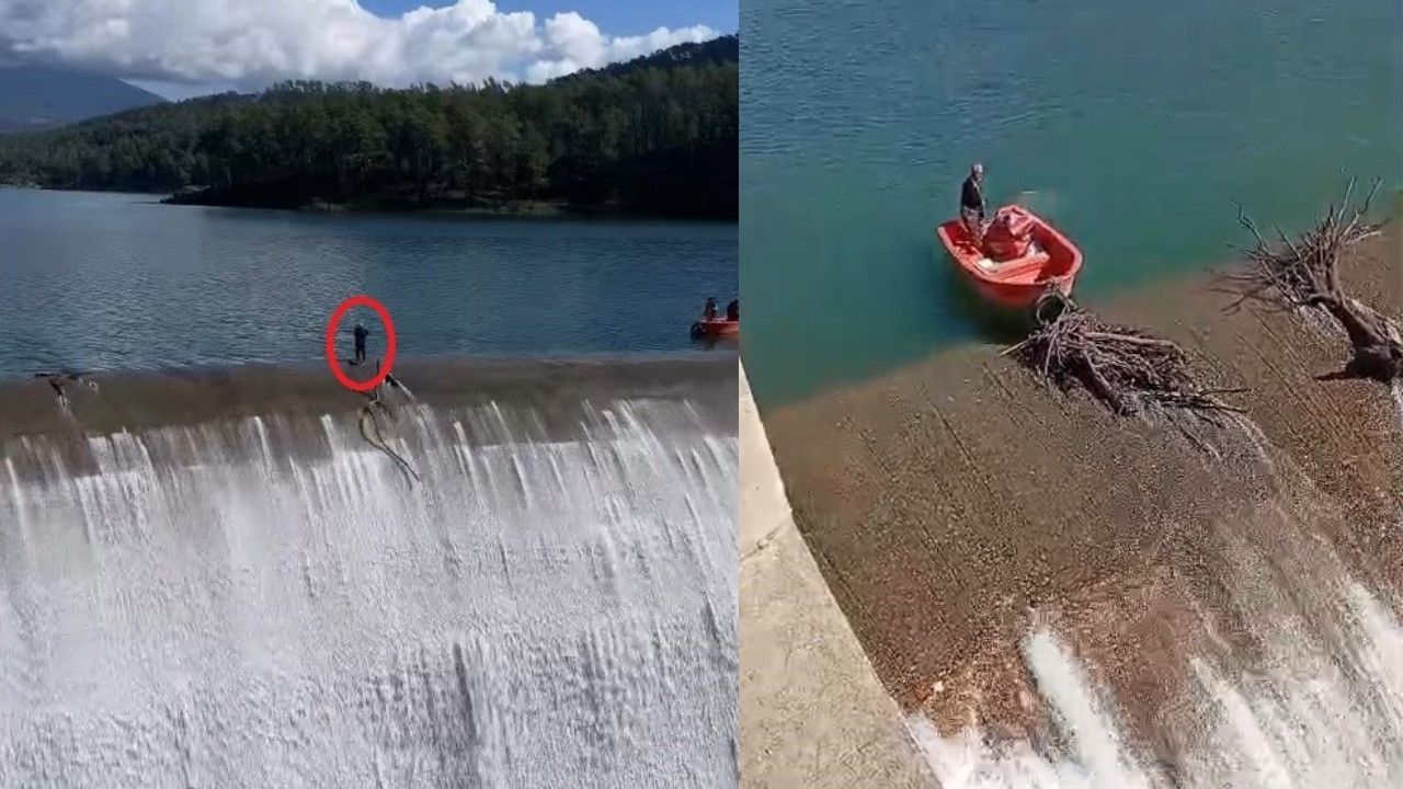 Kumluca ilçesine bağlı Çayiçi Mahallesi sınırları içinde bulunan Alakır Barajı'nda alabalık üreten Nuri Yurtseven, dolu savakta takılan çalı ve ağaçları önce tekne ile ardından yürüyerek gidip temizledi. Suyun döküldüğü alanda temizlik yapan Yurtseven'i görenlerin yüreği ağzına geldi. Vatandaşlar o anları cep telefonlarıyla görüntüledi. Nuri Yurtseven, "Çalı atıklarını temizleyeyim demiştim. Köprünün 15 metre genişliği, 200 metre uzunluğu var. Öyle tehlikeli bir durum yok. Arkadaşlar da beni çekmiş. Buralar bizden sorulur. Asayiş berkemal" dedi.