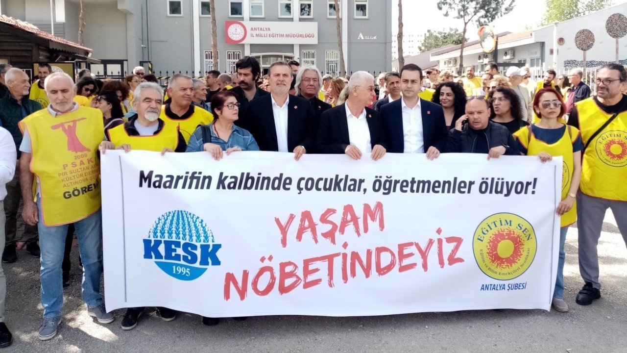 Eğitim-Sen Antalya Şubesi öncülüğünde gerçekleştirilen eylem, Antalya İl Milli Eğitim Müdürlüğü önünde yapıldı. Açıklamaya, Cumhuriyet Halk Partisi Antalya İl Başkanı Nail Kamacı, CHP Muratpaşa İlçe Başkanı Okan Can Kıran ve çok sayıda sivil toplum kuruluşu temsilcisi katıldı. Eğitim-Sen Antalya Şube Başkan Yardımcısı Çiğdem Altıntaş Peker, burada yaptığı açıklamada, Ankara’da başlatılan “yaşam nöbetine” destek verdiklerini belirterek, eğitim emekçilerinin güvenli ve insanca çalışma koşulları talebini yinelediklerini söyledi.