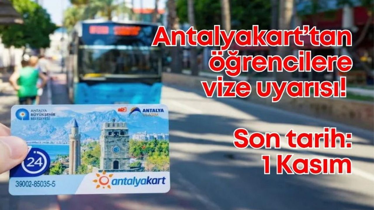 Öğrencilik hakkı devam etmeyen kart sahiplerinin, güncel belgelerini kisisel.antalyakart.com.tr adresine yüklemeleri gerektiği bildirildi. Vize işlemleri, kart dolum cihazlarından tamamlanacak ve yeni vize tarihi 01.11.2026 olacak.