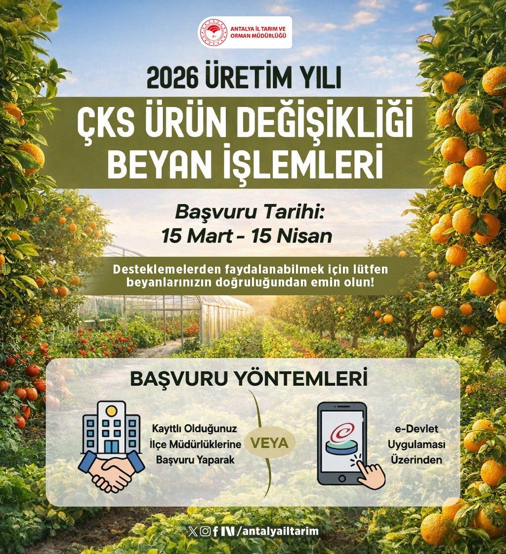 Antalya İl Tarım ve Orman Müdürlüğü, 2026 üretim yılı Çiftçi Kayıt Sistemi (ÇKS) ürün değişikliği beyanları için üreticilere önemli bir uyarıda bulundu. Müdürlükten yapılan açıklamada, başvuruların 15 Mart’ta başlayacağı ve 15 Nisan’a kadar devam edeceği belirtilirken, doğru beyanda bulunmayan üreticilerin tarımsal desteklemelerden yararlanamayabileceği vurgulandı.