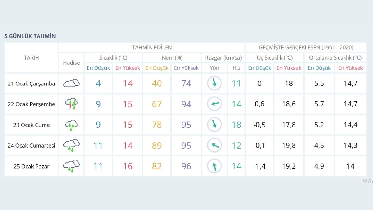 Hafta sonu da Antalyalıları yağışlı bir hava bekleniyor. Cumartesi ve Pazar günleri sağanak yağmurun aralıklarla devam edeceği, hava sıcaklıklarının ise 14-16 derece aralığında olacağı tahmin ediliyor. Nem oranının yüksek seyretmesi nedeniyle hissedilen sıcaklıkların daha düşük olması bekleniyor.