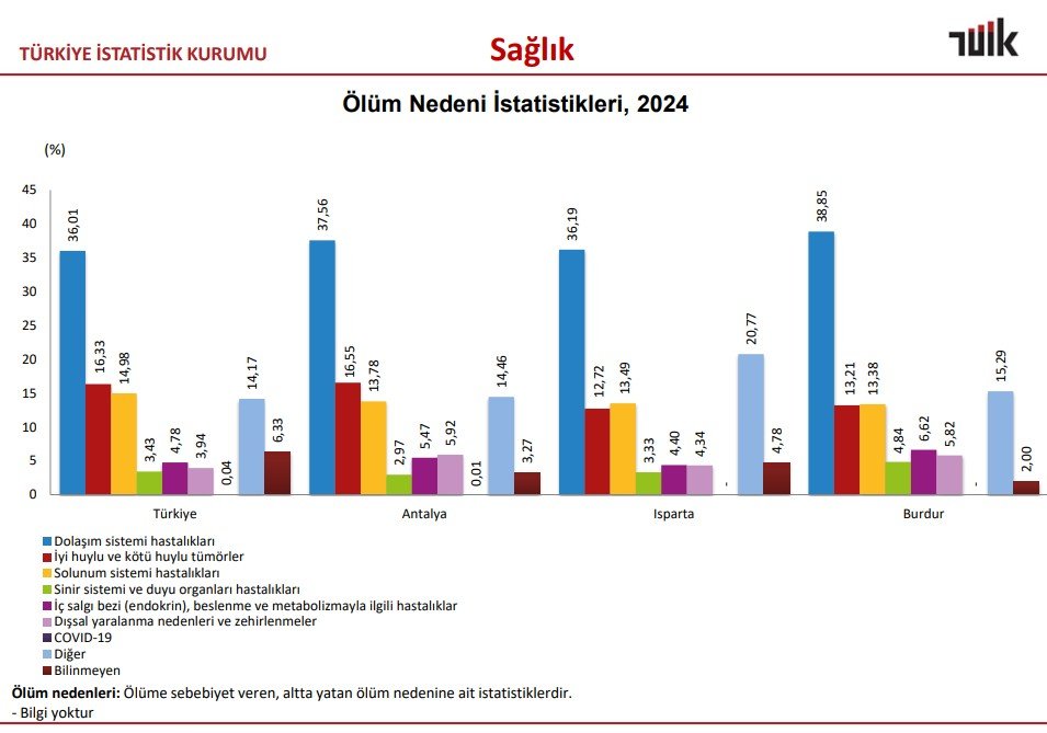 Türkiye İstatistik Kurumu tarafından açıklanan 2024 yılı ölüm nedeni istatistikleri, Antalya ile Türkiye genelini karşılaştırdığımızda çarpıcı farklılıklar ortaya koydu. Dolaşım sistemi hastalıkları her iki ölçekte de ilk sırada yer alırken, bazı hastalık gruplarında Antalya’nın Türkiye ortalamasından belirgin şekilde ayrıldığı görüldü.