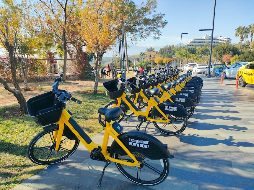 Elektrikli bisiklet “tazı” kısa sürede şehrin her noktasında kullanımı ve sayısı hızla artmaya başladı. Özellikle turistik noktalarda artık bir istasyonda çok sayıda bisiklet görmek mümkün hale geldi. Hem turistlerin hem de özellikle gençlerin artık “tazı” ile seyahat ettiği görüntülendi. Konyaaltı varyant seyir terasının oraya bırakılan bisikletler ile turistler ve vatandaşlar şehir turuna çıkıyor.