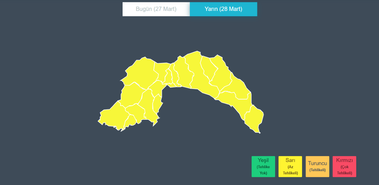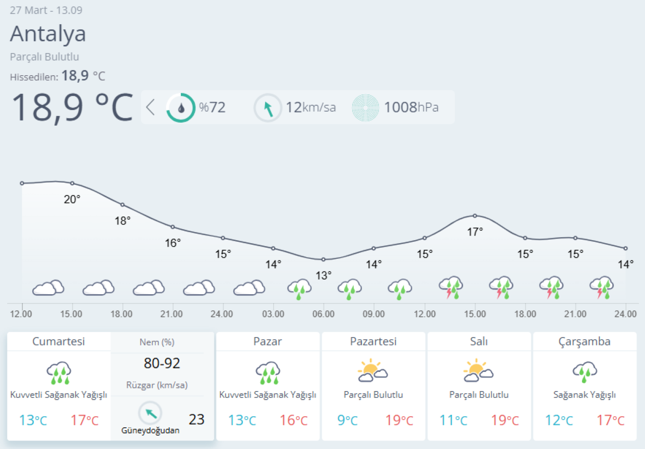 Meteoroloji verilerine göre, 28 Mart Cumartesi günü saat 12.00’den itibaren Antalya genelinde yerel olarak kuvvetli (21-50 kg/m²) sağanak ve gök gürültülü sağanak yağış bekleniyor. Yağışların 29 Mart sabah saatlerine kadar etkili olması öngörülüyor.