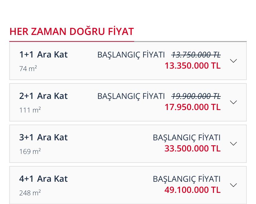 Projede yer alacak konutlara ilişkin fiyatlar da emlak siteleri ve sektör temsilcileri tarafından paylaşılmaya başlandı. Buna göre projede, 1+1 ve 74 metrekare büyüklüğündeki dairelerin başlangıç fiyatı 13 milyon 350 bin TL, 2+1 ve 111 metrekare dairelerin 17 milyon 950 bin TL, 3+1 ve 169 metrekare dairelerin 33 milyon 500 bin TL, 4+1 ve 248 metrekare dairelerin ise 49 milyon 100 bin TL olarak belirlendi.