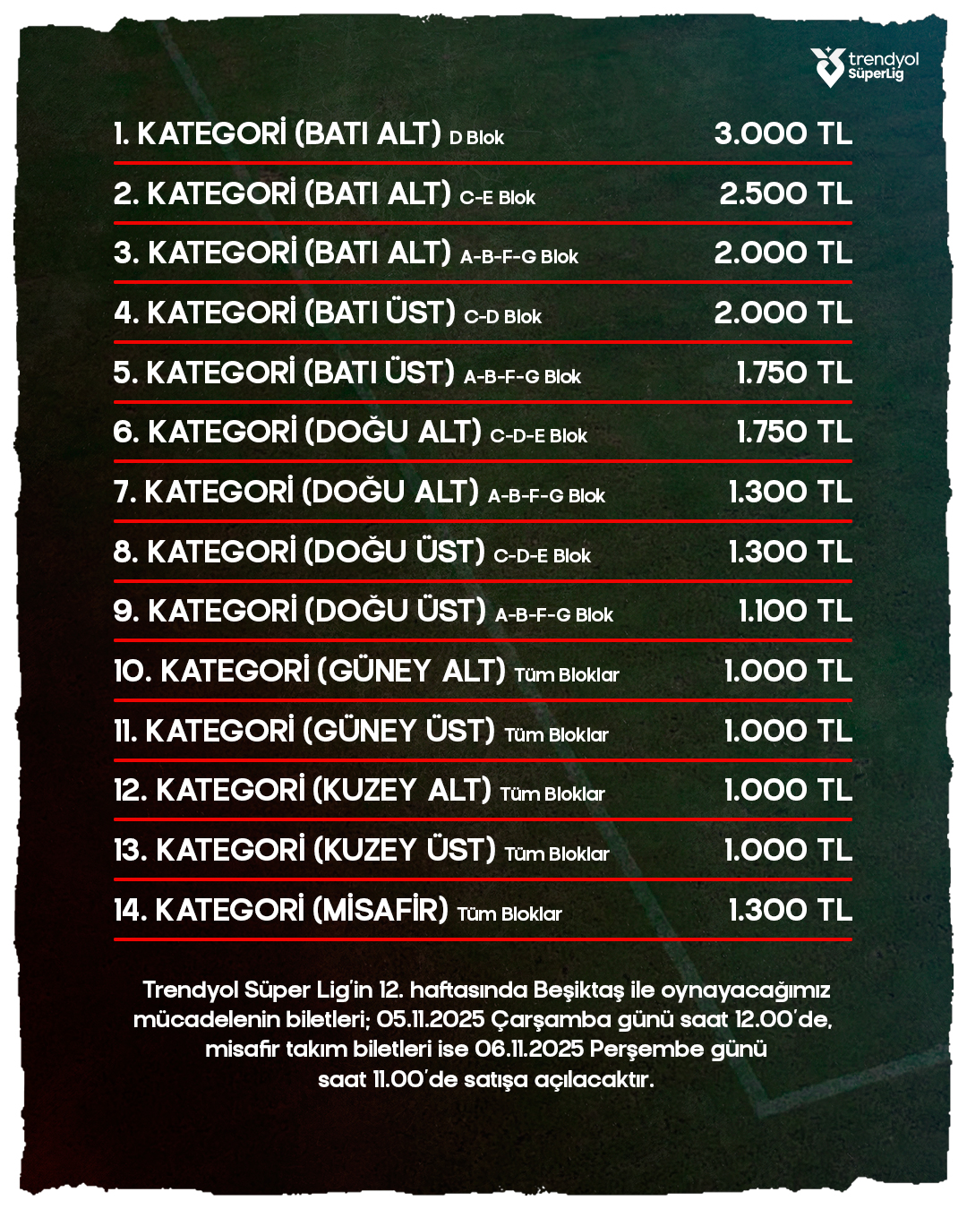 Stadyumun kale arkası tribünleri, yani Güney Alt ve Güney Üst ile Kuzey Alt ve Kuzey Üst tribünlerinin tüm blokları ise en uygun seçenekler olarak 1.000 TL sabit fiyatla satışa çıktı. Beşiktaş taraftarları için ayrılan Misafir Takım tribünü bilet fiyatı ise 1.300 TL olarak duyuruldu. Ligin üst sıralarını yakından ilgilendiren bu kritik mücadelenin, belirlenen bu fiyatlarla birlikte taraftarlar tarafından yoğun ilgi görmesi bekleniyor.